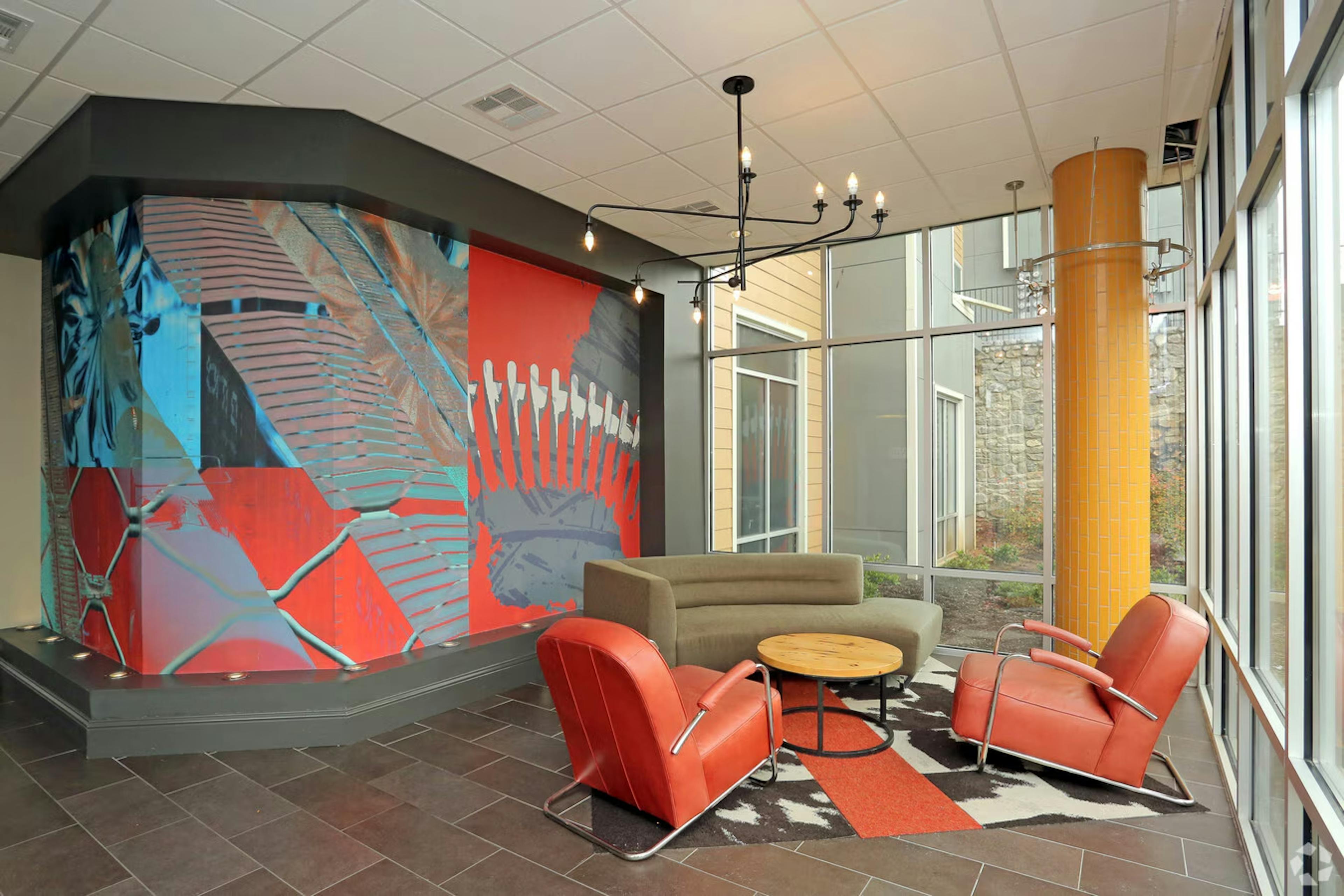 The overall environment promotes connection and well-being. Communal areas are open and inviting, encouraging interaction and collaboration, while quieter zones provide spaces for focus and retreat. Natural light is maximized through large windows along Stadium Drive, enhancing the sense of openness and connecting the interior to the surrounding urban and campus context.